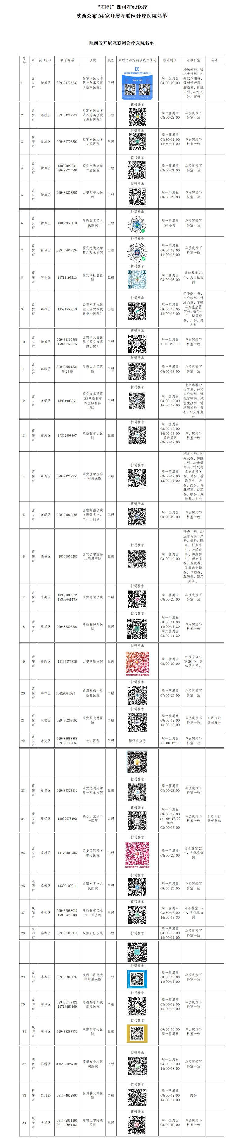 西安、咸陽、渭南、延安34家醫(yī)院已上線互聯(lián)網(wǎng)診療服務(wù),廣大患者可通過掃碼登錄訪問醫(yī)院的互聯(lián)網(wǎng)診療平臺即可獲得問診、復(fù)診等線上醫(yī)療服務(wù)。名單如下: