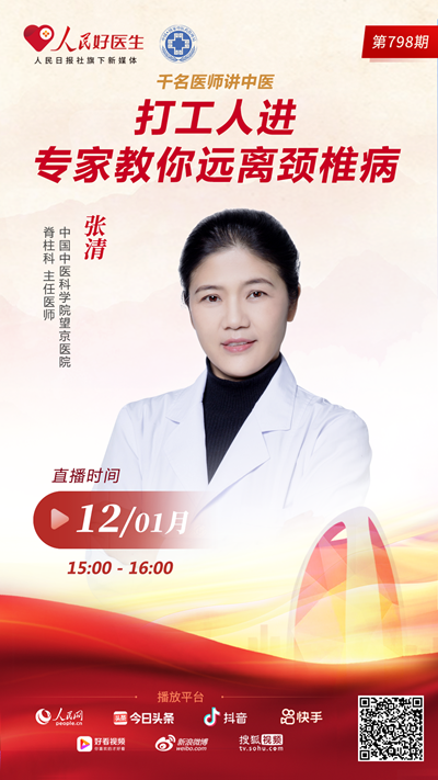 1月12日15:00至16:00,人民日?qǐng)?bào)社旗下新媒體平臺(tái)“人民好醫(yī)生”與國家中醫(yī)藥管理局辦公室聯(lián)合推出的“千名醫(yī)師講中醫(yī)”系列直播將邀請(qǐng)中國中醫(yī)科學(xué)院望京醫(yī)院脊柱科主任醫(yī)師張清做客直播間,為大家詳細(xì)講解頸椎病的治療方法。