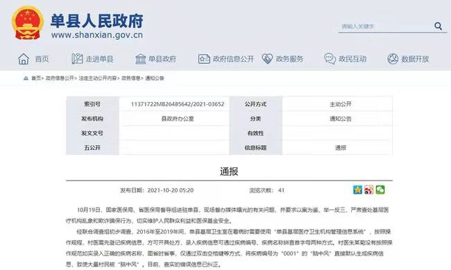 山東菏澤單縣通報(bào)“全村腦中風(fēng)”事件。單縣人民政府官網(wǎng)截圖