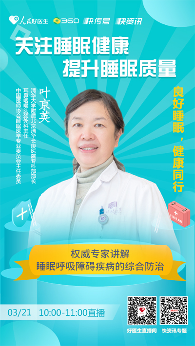 3月21日10:00,清華大學(xué)附屬北京清華長庚醫(yī)院?撇坎块L、耳鼻咽喉頭頸外科主任、中國醫(yī)師協(xié)會(huì)睡眠醫(yī)學(xué)專業(yè)委員會(huì)主任委員葉京英將做客“人民好醫(yī)生”APP直播間,與大家分享睡眠呼吸障礙疾病的綜合防治相關(guān)科普知識(shí)。歡迎屆時(shí)收看。