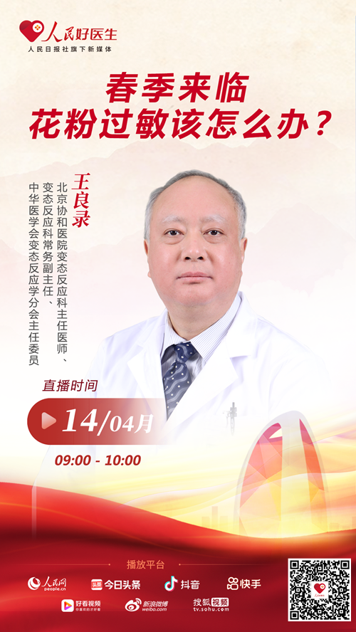 4月14日9:00,北京協(xié)和醫(yī)院變態(tài)反應(yīng)科主任醫(yī)師、變態(tài)反應(yīng)科常務(wù)副主任、中華醫(yī)學(xué)會變態(tài)反應(yīng)學(xué)分會主任委員王良錄將做客“人民好醫(yī)生”APP直播間,與大家分享相關(guān)春季花粉過敏防治科普知識。