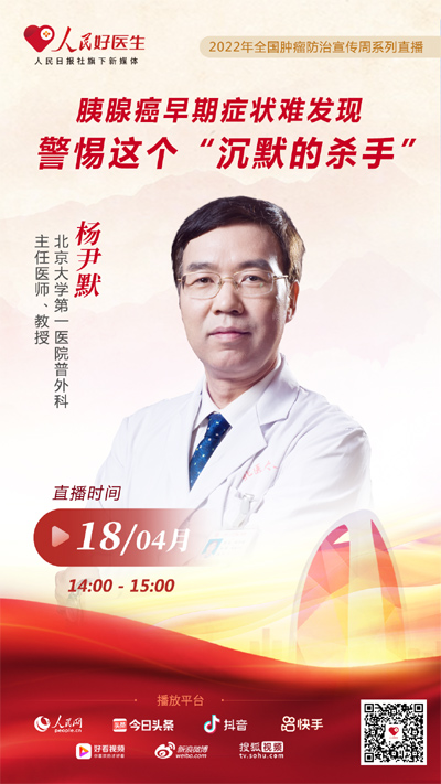 4月18日14:00,“人民好醫(yī)生”客戶端將邀請到北京大學(xué)第一醫(yī)院普外科主任醫(yī)師楊尹默做客演播室,圍繞胰腺癌早期防治這一主題跟大家聊一聊,讓公眾與患者了解疾病的危害。