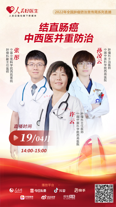 4月19日14:00,中國中醫(yī)科學院西苑醫(yī)院腫瘤科主任醫(yī)師許云、中國中醫(yī)科學院西苑醫(yī)院腫瘤科副主任醫(yī)師張彤、中國中醫(yī)科學院西苑醫(yī)院腫瘤科主治醫(yī)師孫凌云將做客“人民好醫(yī)生”健康科普直播間,與大家就結直腸癌中西醫(yī)結合防治的相關問題進行分享。