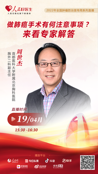 4月19日15:30,首都醫(yī)科大學(xué)附屬北京胸科醫(yī)院胸外二科副主任周世杰將做客“人民好醫(yī)生”客戶端直播間,向廣大網(wǎng)友分享肺癌手術(shù)相關(guān)知識(shí),歡迎屆時(shí)收看。