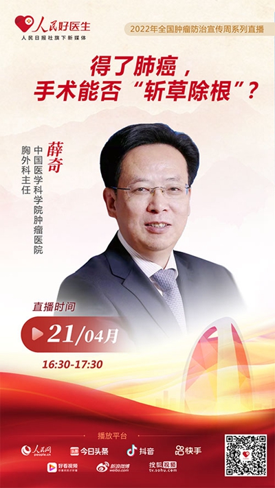 說起肺癌,大家并不陌生。不僅擁有較高的發(fā)病率與死亡率,而且患者的發(fā)病年齡也逐漸年輕化……因此,公眾對(duì)肺癌的正確認(rèn)知就變得尤為重要。4月21日16:30至17:30,“人民好醫(yī)生”客戶端將邀請(qǐng)中國(guó)醫(yī)學(xué)科學(xué)院腫瘤醫(yī)院胸外科主任薛奇做客演播室,從外科醫(yī)生的角度與我們一起來說說肺癌防治那些事兒。