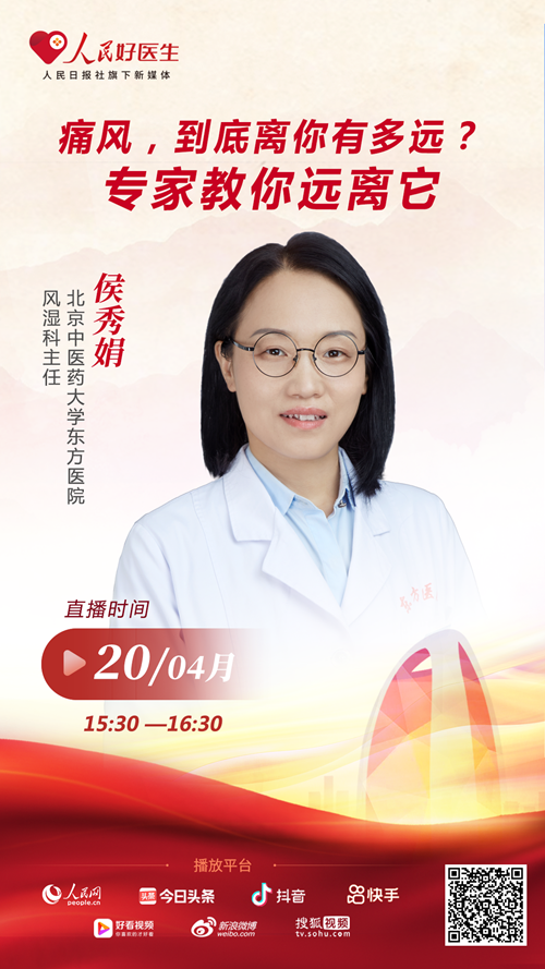 4月20日15:30,北京中醫(yī)藥大學(xué)東方醫(yī)院風(fēng)濕科主任侯秀娟將做客“人民好醫(yī)生”客戶端直播間,向廣大網(wǎng)友分享痛風(fēng)防治相關(guān)知識。