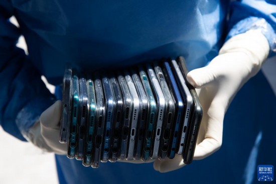 5月4日,在上海浦東北蔡鎮(zhèn)設(shè)立的醫(yī)護(hù)集散點(diǎn),參加核酸采樣的志愿者領(lǐng)取用于掃碼登記的手機(jī)。
