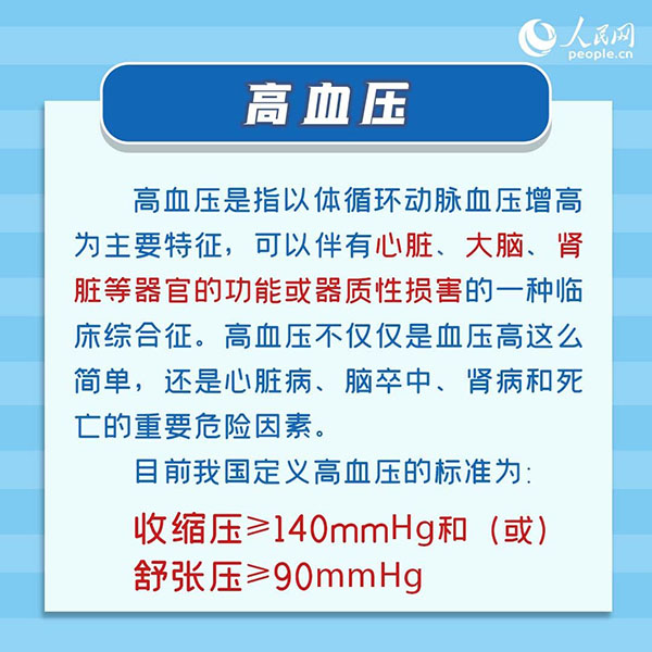 “高血壓是指以體循環(huán)動(dòng)脈血壓增高為主要特征,可以伴有心臟、大腦、腎臟等器官的功能或器質(zhì)性損害的一種臨床綜合征!笔锥坚t(yī)科大學(xué)附屬北京友誼醫(yī)院心血管中心黃榕翀教授在接受人民網(wǎng)記者采訪時(shí)介紹,目前我國定義高血壓的標(biāo)準(zhǔn)為,收縮壓≥140mmHg和(或)舒張壓≥90mmHg。