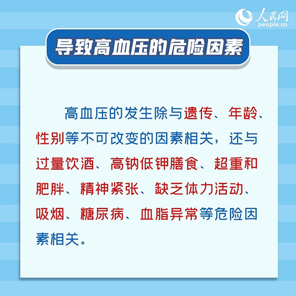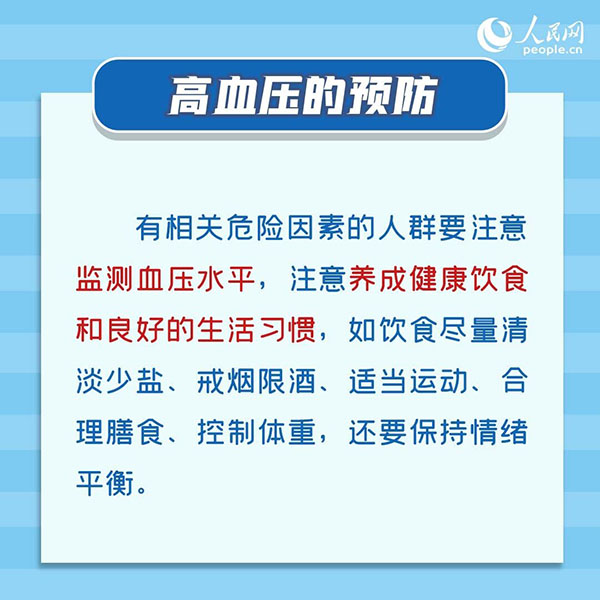 “研究發(fā)現(xiàn),高血壓的發(fā)生除與遺傳、年齡、性別等不可改變的因素相關(guān),還與過量飲酒、高鈉低鉀膳食、超重和肥胖、精神緊張、缺乏體力活動(dòng)、吸煙、糖尿病、血脂異常等危險(xiǎn)因素相關(guān)!秉S榕翀教授建議,有上述相關(guān)危險(xiǎn)因素的人群要注意監(jiān)測血壓水平,注意養(yǎng)成健康飲食和良好的生活習(xí)慣,如飲食盡量清淡少鹽、戒煙限酒、適當(dāng)運(yùn)動(dòng)、合理膳食、控制體重,還要保持情緒平衡。