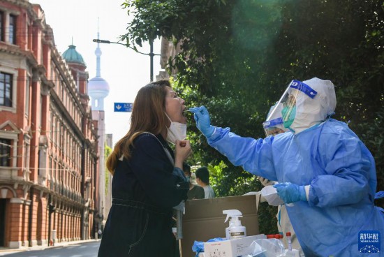 居民在上海市黃浦區(qū)核酸篩查點接受采樣(5月7日攝)。新華社記者 李賀 攝