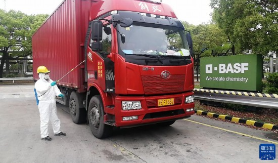 工作人員在位于上海市金山區(qū)的巴斯夫護(hù)理化學(xué)品(上海)有限公司工廠對貨車進(jìn)行消殺(4月15日攝)。新華社記者 丁汀 攝