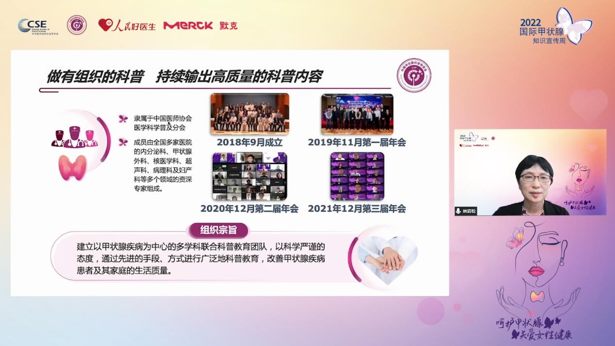 “雖然我國甲狀腺疾病患者龐大,但患病知曉率低,且相關(guān)健康信息獲取渠道繁雜、內(nèi)容真?zhèn)坞y辨!绷謳r松說,為科學(xué)系統(tǒng)地開展科普教育,甲狀腺科普學(xué)組已連續(xù)三年舉辦甲狀腺科普視頻大賽,通過流行的短視頻形式對甲狀腺疾病進(jìn)行趣味、生動的科普傳播,讓公眾獲得兼具權(quán)威性、科學(xué)性與趣味性的醫(yī)學(xué)科普知識,以期實(shí)現(xiàn)改善甲狀腺疾病患者及其家庭的生活質(zhì)量。今年將啟動第四屆甲狀腺科普視頻大賽!跋Ml(fā)揮社會各界力量,共同提升公眾對于甲狀腺疾病的認(rèn)知,對女性等重點(diǎn)人群廣泛普及甲狀腺疾病癥狀和危害,敦促盡早篩查、就醫(yī)”。