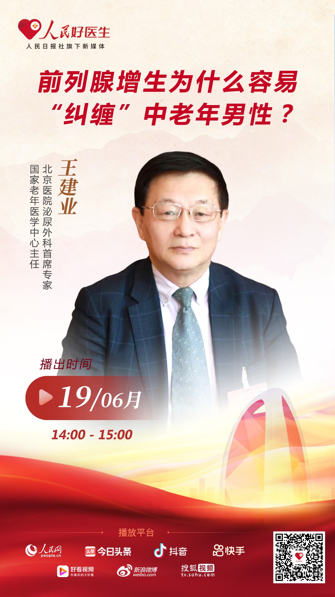6月19日14:00,北京醫(yī)院泌尿外科首席專(zhuān)家、國(guó)家老年醫(yī)學(xué)中心主任王建業(yè)將做客“人民好醫(yī)生”客戶(hù)端,就前列腺增生相關(guān)話(huà)題與大家進(jìn)行分享。