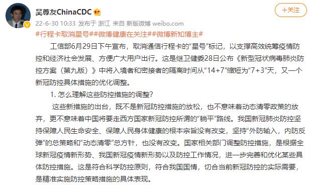 人民網(wǎng)北京6月30日電 (記者喬業(yè)瓊)工信部6月29日下午宣布,取消通信行程卡的“星號(hào)”標(biāo)記,以支撐高效統(tǒng)籌疫情防控和經(jīng)濟(jì)社會(huì)發(fā)展、方便廣大用戶出行。這是繼衛(wèi)健委28日公布《新型冠狀病毒肺炎防控方案(第九版)》中將入境者和密接者的隔離時(shí)間從“14+7”縮短為“7+3”天,又一個(gè)新冠防控具體措施的優(yōu)化調(diào)整。對(duì)此,中國疾控中心流行病學(xué)首席專家吳尊友今日上午在其微博上表示,這符合科學(xué)防控原則,符合我國國情,切合當(dāng)前新冠防控的實(shí)際需要,是精準(zhǔn)實(shí)施防控策略措施的具體表現(xiàn)。