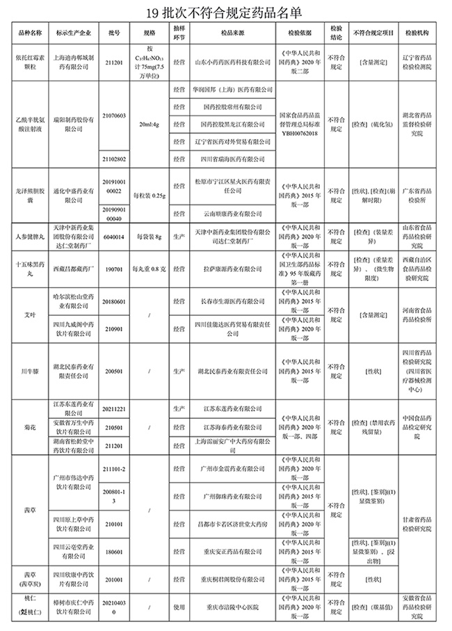 國家藥監(jiān)局表示,對(duì)上述不符合規(guī)定藥品,藥品監(jiān)督管理部門已要求相關(guān)企業(yè)和單位采取暫停銷售使用、召回等風(fēng)險(xiǎn)控制措施,對(duì)不符合規(guī)定原因開展調(diào)查并切實(shí)進(jìn)行整改。