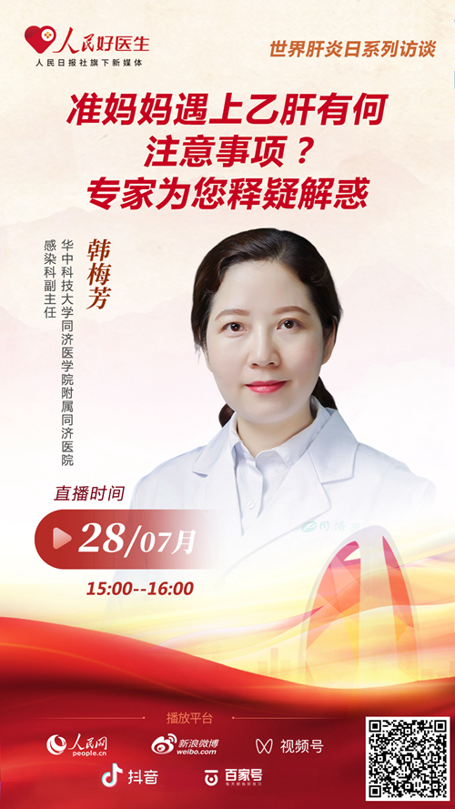 7月28日15:00,華中科技大學(xué)同濟(jì)醫(yī)學(xué)院附屬同濟(jì)醫(yī)院感染科副主任韓梅芳將做客“人民好醫(yī)生”客戶端直播間,向廣大網(wǎng)友分享乙肝母嬰阻斷的相關(guān)知識(shí),歡迎屆時(shí)收看。