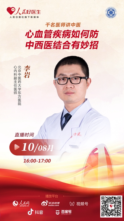 8月10日16:00-17:00,“人民好醫(yī)生”與國家中醫(yī)藥管理局辦公室聯(lián)合推出的“千名醫(yī)師講中醫(yī)”系列直播將邀請北京中醫(yī)藥大學東方醫(yī)院心內科副主任醫(yī)師李巖做客直播間,為大家講解心血管疾病防治相關知識,千萬不要錯過。