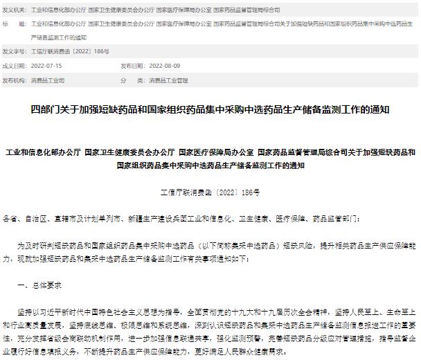 四部門聯(lián)合發(fā)文 加強對短缺藥品和集采中選藥品生產(chǎn)儲備監(jiān)測