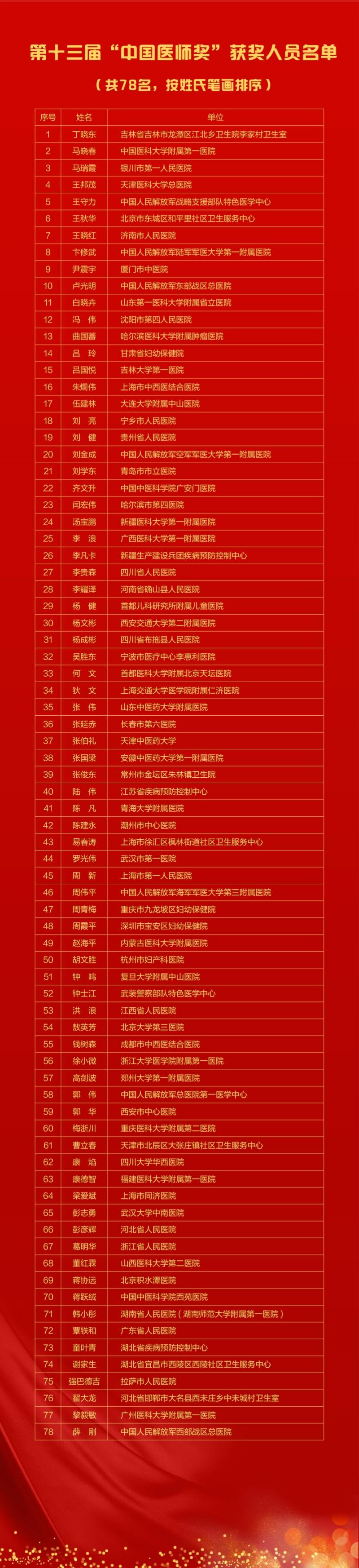編者按:從抗“非典”到斗“甲流”再到抗擊新冠疫情,在第一線不懈奮斗,她初心不改;35載20余萬張膠片,練就一雙“火眼金睛”,他孜孜不倦;挑戰(zhàn)傳統(tǒng)血液腫瘤治療方式,用鉆研與創(chuàng)新造;颊,他竭盡所能……今年,共有78名優(yōu)秀醫(yī)師獲得“中國醫(yī)師獎”這一行業(yè)最高殊榮。白衣鮮處,黨旗飄揚;健康使者,大愛無疆。正值第五個中國醫(yī)師節(jié),向一直守護我們健康的白衣天使們致敬!