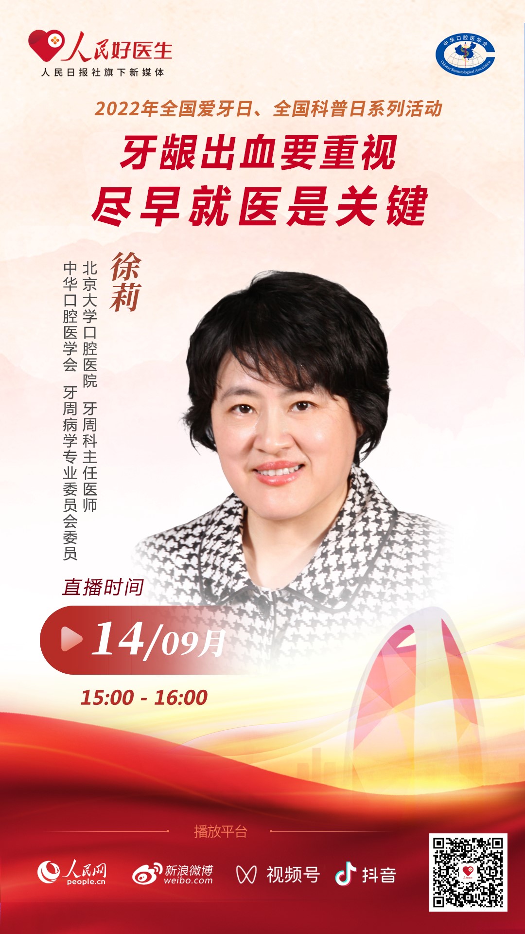 9月14日15:00,北京大學(xué)口腔醫(yī)院牙周科主任醫(yī)師、中華口腔醫(yī)學(xué)會牙周病學(xué)專業(yè)委員會委員徐莉?qū)⒆隹汀叭嗣窈冕t(yī)生”客戶端,和大家聊一聊牙齦出血和青少年患牙齦炎的相關(guān)知識。