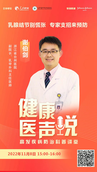 11月8日15:00,“人民好醫(yī)生”客戶端將邀請浙江省臺州醫(yī)院黨委委員、副院長、乳腺甲狀腺外科副主任謝伯劍,給大家科普乳腺結(jié)節(jié)的相關(guān)知識。