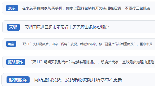 聚焦電商領(lǐng)域,“人民投訴”用戶投訴多聚焦在:平臺(tái)自營、旗艦店商品質(zhì)量“雙標(biāo)”;貨不對(duì)板、少發(fā)漏發(fā);退差價(jià)、保價(jià)設(shè)置“障礙”等方面。服飾美妝領(lǐng)域的突出問題是:以次充好;虛擬發(fā)貨;試穿后或以外包裝損壞為由拒不退貨;預(yù)付比直接買還貴等。