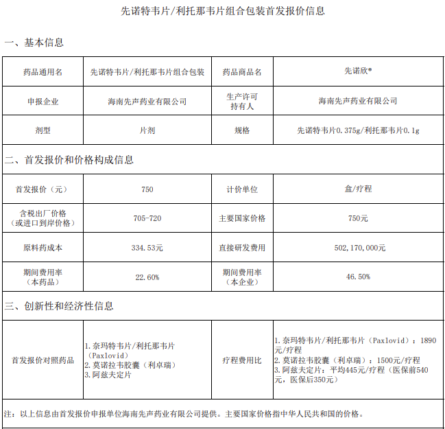 公示信息顯示,先諾特韋片/利托那韋片組合包裝的首發(fā)報(bào)價(jià)為750元/盒,含稅出廠價(jià)格(或進(jìn)口到岸價(jià)格)為705-720元/盒,原料藥成本為334.53元,直接研發(fā)費(fèi)用為502170000元。首發(fā)報(bào)價(jià)對照藥品包括奈瑪特韋片/利托那韋片(Paxlovid)、莫諾拉韋膠囊(利卓瑞)和阿茲夫定片。