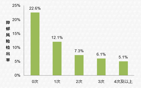 不同運(yùn)動(dòng)頻率下的抑郁風(fēng)險(xiǎn)檢出率。 資料來(lái)源:《中國(guó)國(guó)民心理健康發(fā)展報(bào)告(2021-2022)》