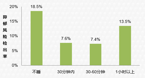 不同午睡時(shí)長(zhǎng)下的抑郁風(fēng)險(xiǎn)檢出率。 資料來(lái)源:《中國(guó)國(guó)民心理健康發(fā)展報(bào)告(2021-2022)》