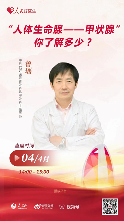 4月4日14:00,中日友好醫(yī)院普外科乳甲外科主任醫(yī)師魯瑤將做客人民日報社旗下新媒體“人民好醫(yī)生”客戶端,圍繞甲狀腺疾病相關(guān)問題進行交流分享。