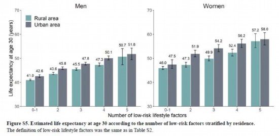 該研究整合了中國慢性病前瞻性研究(China Kadoorie Biobank,CKB)約50萬人數(shù)據(jù)、中國居民營養(yǎng)與健康監(jiān)測(China Nutrition and Health Surveillance,CNHS)以及全球疾病負擔研究(Global Burden of Diseases, Injuries, and Risk Factors Study,GBD)3個數(shù)據(jù)庫,通過使用壽命周期表法來估計中國人群30歲時不同生活方式水平下的期望壽命。