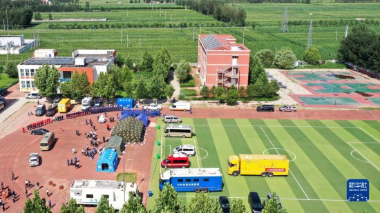 8月6日,在平原縣王打卦中心小學(xué),應(yīng)急救援隊(duì)伍集結(jié)待命(無(wú)人機(jī)照片)。新華社記者 郭緒雷 攝