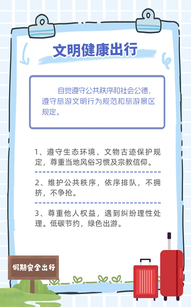 編者按:今年的中秋、國慶“兩節(jié)”假期長達8天,讓大家的出行熱情格外高漲。近日,全國各地陸續(xù)迎來出行高峰,假期外出游玩、走親訪友,一定要做好充分準備、注意出行安全。這份提示請收好!