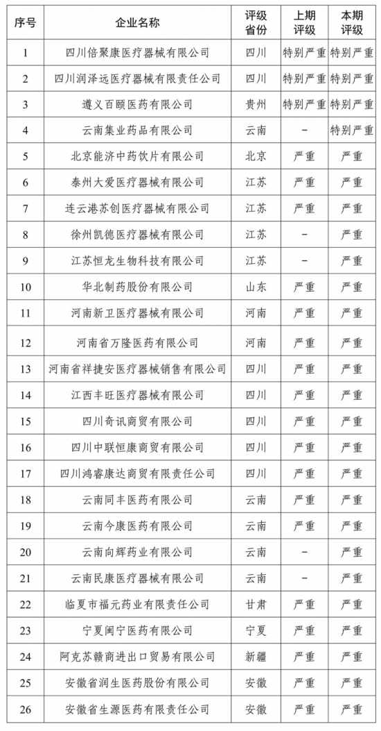 4家評級為“特別嚴重”的醫(yī)藥企業(yè)分別為四川倍聚康醫(yī)療器械有限公司、四川潤澤遠醫(yī)療器械有限責任公司、遵義百頤醫(yī)藥有限公司、云南集業(yè)藥品有限公司。22家評級為“嚴重”的醫(yī)藥企業(yè)包括北京能濟中藥飲品有限公司、泰州大愛醫(yī)療器械有限公司、連云港蘇創(chuàng)醫(yī)療器械有限公司等。