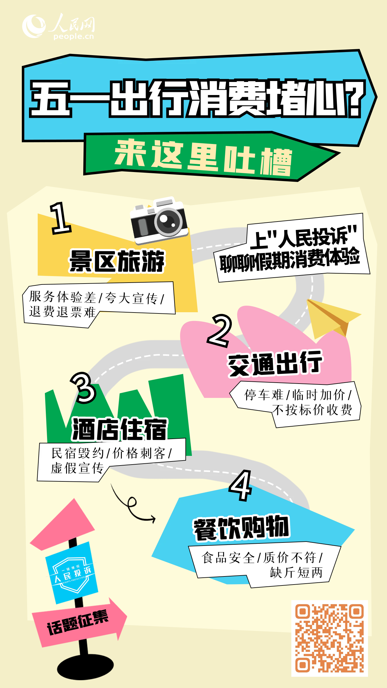 今年“五一”假期消費(fèi)熱度有望再度增長(zhǎng),帶動(dòng)消費(fèi)市場(chǎng)進(jìn)一步回升向好。為提升假日消費(fèi)市場(chǎng)服務(wù)供給質(zhì)量,營(yíng)造誠(chéng)信、放心、舒心的消費(fèi)環(huán)境,即日起,人民網(wǎng)“人民投訴”平臺(tái)將征集廣大網(wǎng)友在“五一”期間“吃住行游購(gòu)?qiáng)省毕M(fèi)方面的相關(guān)維權(quán)線索,如果您遭遇此類權(quán)益侵害,或了解某些欺詐行為中不為人知的陷阱、黑幕,歡迎您掃碼關(guān)注“人民網(wǎng)財(cái)經(jīng)”微信公眾號(hào)或掃描“人民投訴”微信小程序留言、投訴、曝光。