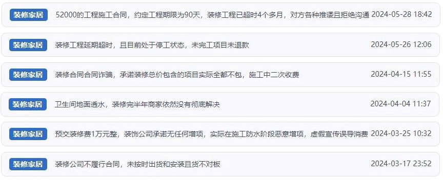 其實(shí),有著同樣遭遇的消費(fèi)者不在少數(shù)。公開報(bào)道顯示,今年以來有多個(gè)家裝機(jī)構(gòu)分公司或經(jīng)銷商跑路,還有個(gè)別不良裝修公司在短時(shí)間內(nèi)聚收大量預(yù)付款后攜款跑路,給消費(fèi)者帶來經(jīng)濟(jì)財(cái)產(chǎn)損失!叭嗣裢对V”梳理發(fā)現(xiàn),除閉店跑路外,目前平臺(tái)上涉及家裝消費(fèi)類的投訴問題多聚焦于——