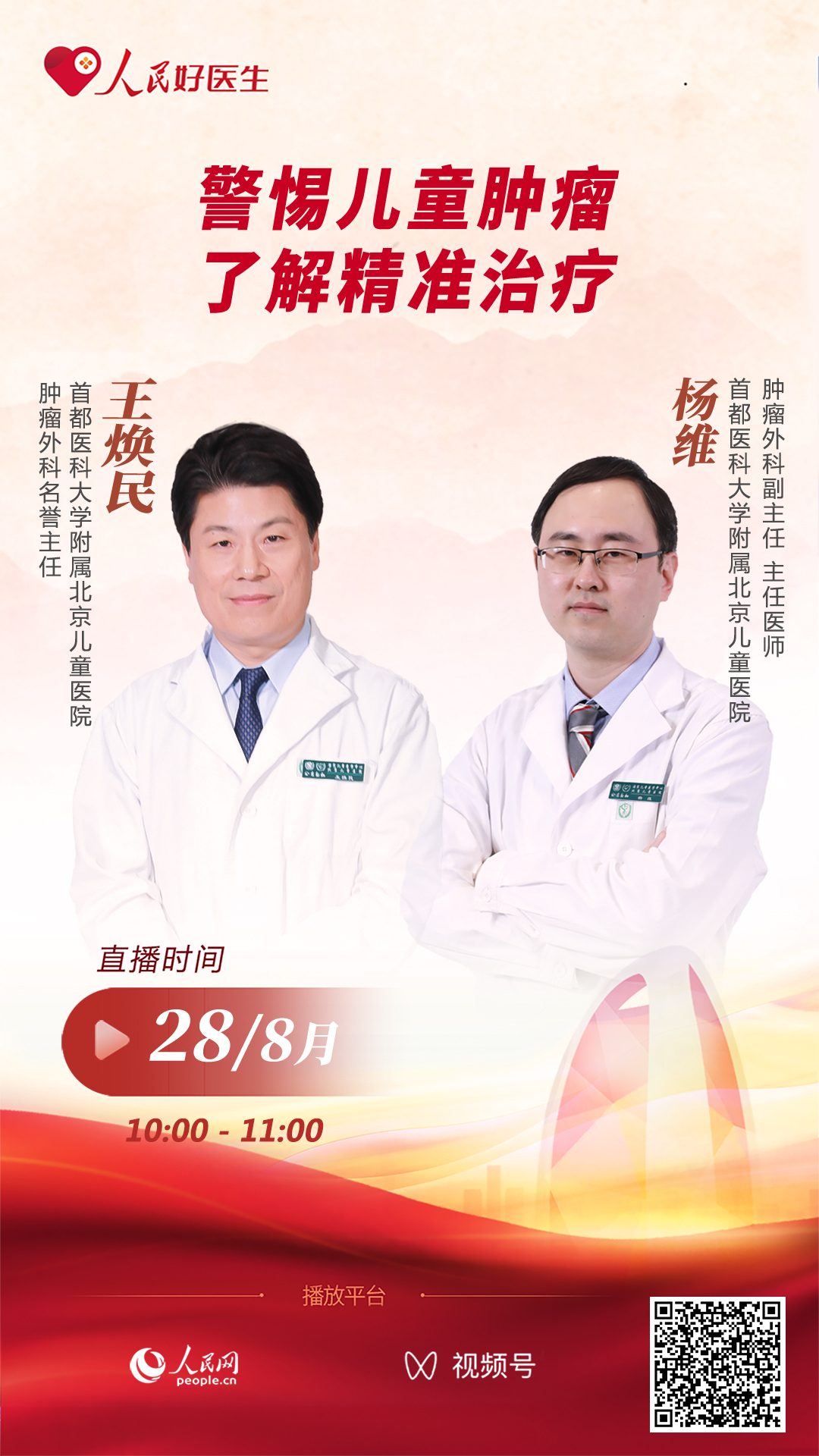8月28日10:00,首都醫(yī)科大學(xué)附屬北京兒童醫(yī)院腫瘤外科名譽主任王煥民,首都醫(yī)科大學(xué)附屬北京兒童醫(yī)院腫瘤外科副主任楊維將做客科普直播間,就大家關(guān)心的兒童腫瘤的相關(guān)內(nèi)容進行分享。
