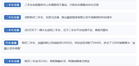 車輛報告弄虛作假,如私自篡改修車記錄、涉水記錄、里程記錄、保險信息、違章信息等,消費者付款后車輛到手使用時方才知曉;商家魚目混珠、以次充好,刻意隱瞞車輛來源,運營車充當(dāng)非運營車輛賣,涉案車輛充當(dāng)正常車輛賣;訂金、押金、保證金隨意收,取消交易后商家拒不退還;交易合同陷阱多,發(fā)票真假難辨,車輛售后維修服務(wù)難保障;實際貸款數(shù)額與申請額度不符、手續(xù)費多少不明了、提前還款收取高額違約金,金融貸款“陷阱”防不勝防……