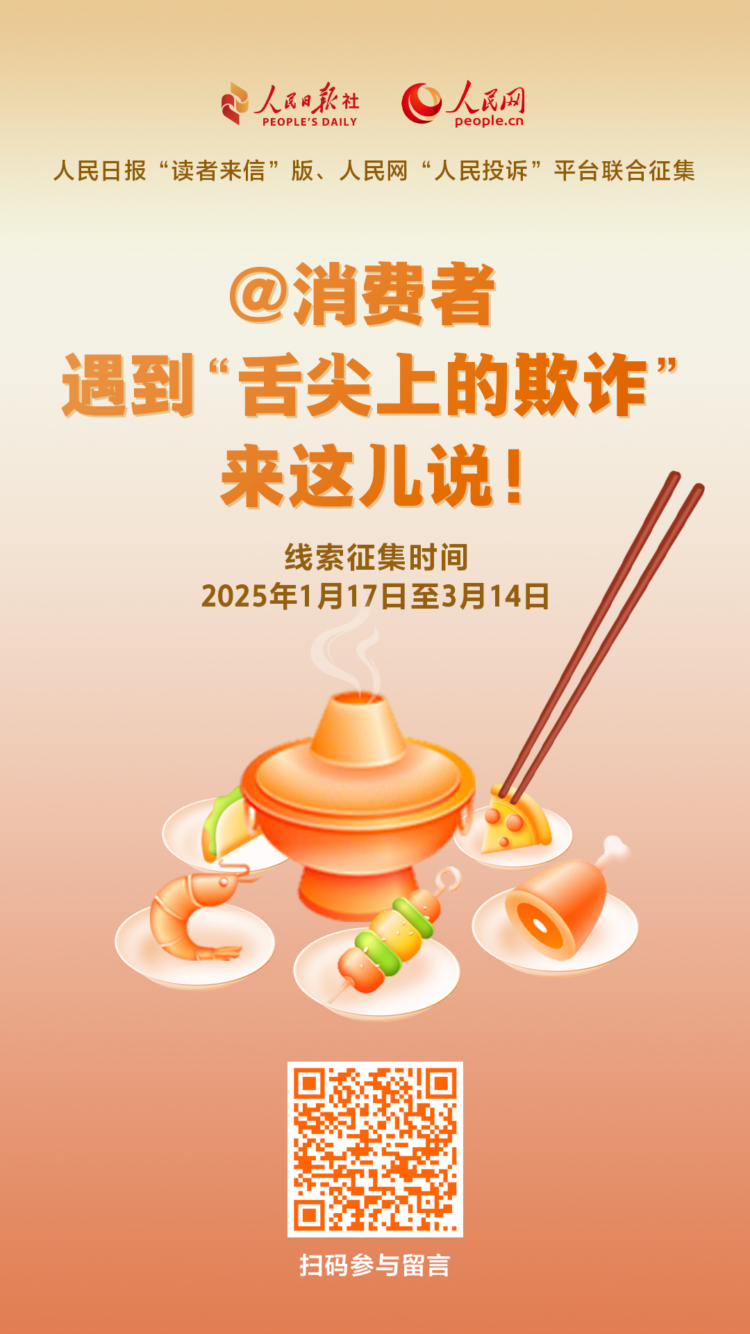 牛肉干里不含牛肉,無糖產(chǎn)品其實含糖,配料表造假、營養(yǎng)成分表不準(zhǔn)確……你遇到過嗎?“以假亂真”“以次充好”為代表的食品欺詐,嚴(yán)重?fù)p害消費者利益,擾亂市場公平競爭秩序。為筑牢食品安全防線,增強(qiáng)消費者信心,即日起,人民日報“讀者來信”版與人民網(wǎng)“人民投訴”平臺聯(lián)合發(fā)起相關(guān)線索征集,歡迎您掃描上方海報二維碼進(jìn)入征集頁面留言或提供調(diào)查線索至人民日報“讀者來信”版(郵箱:dzlx@peopledaily.cn 傳真:010-65368495)。線索征集時間截至2025年3月14日。