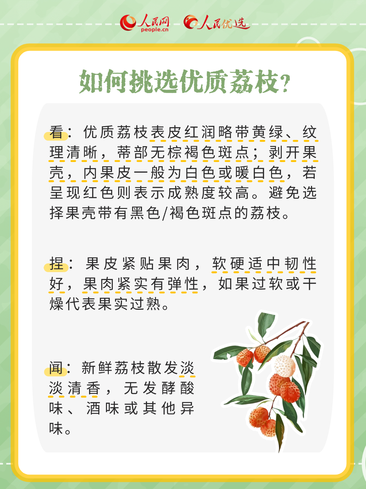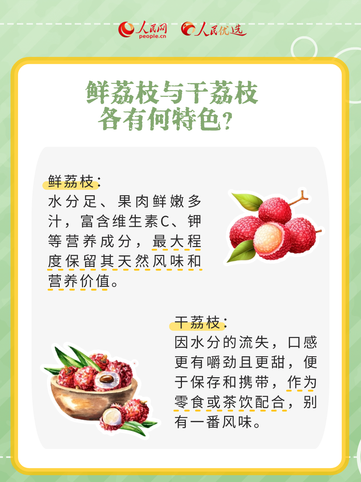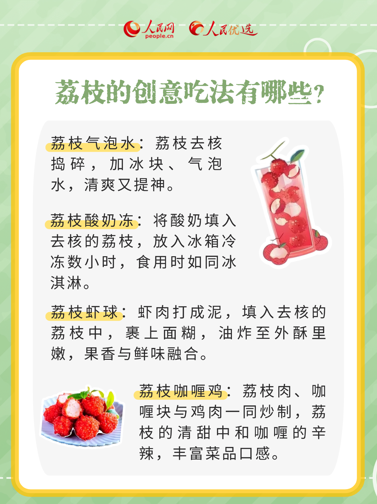 “日啖荔枝三百顆,不辭長作嶺南人。”入夏后,荔枝已經(jīng)陸續(xù)上市。如何挑選到新鮮、美味的荔枝?荔枝買回家后該如何存儲(chǔ)?荔枝的創(chuàng)意吃法有哪些?跟著本期《人民優(yōu)選來了》,一同享受荔枝帶來的夏日限定美味。