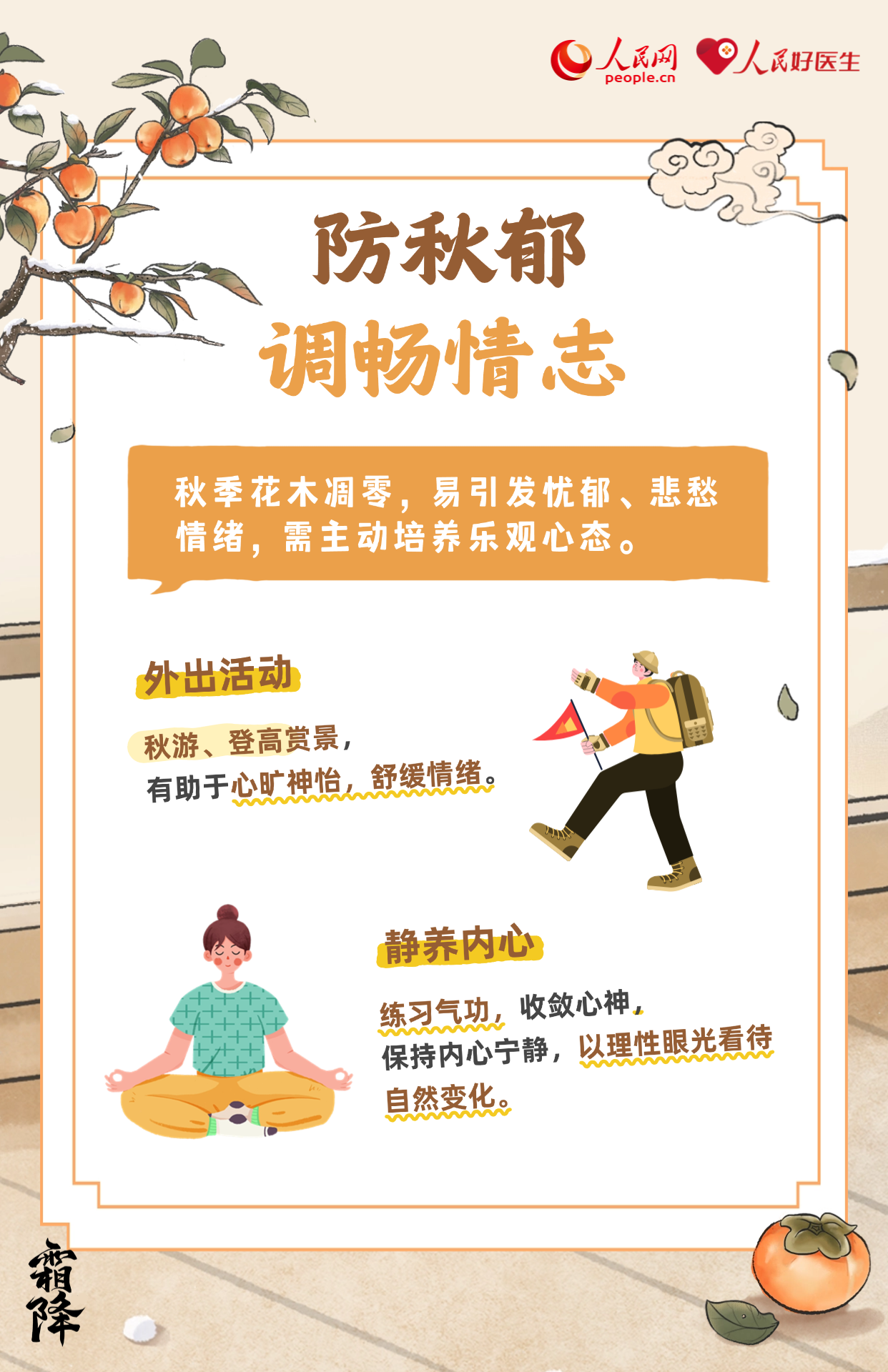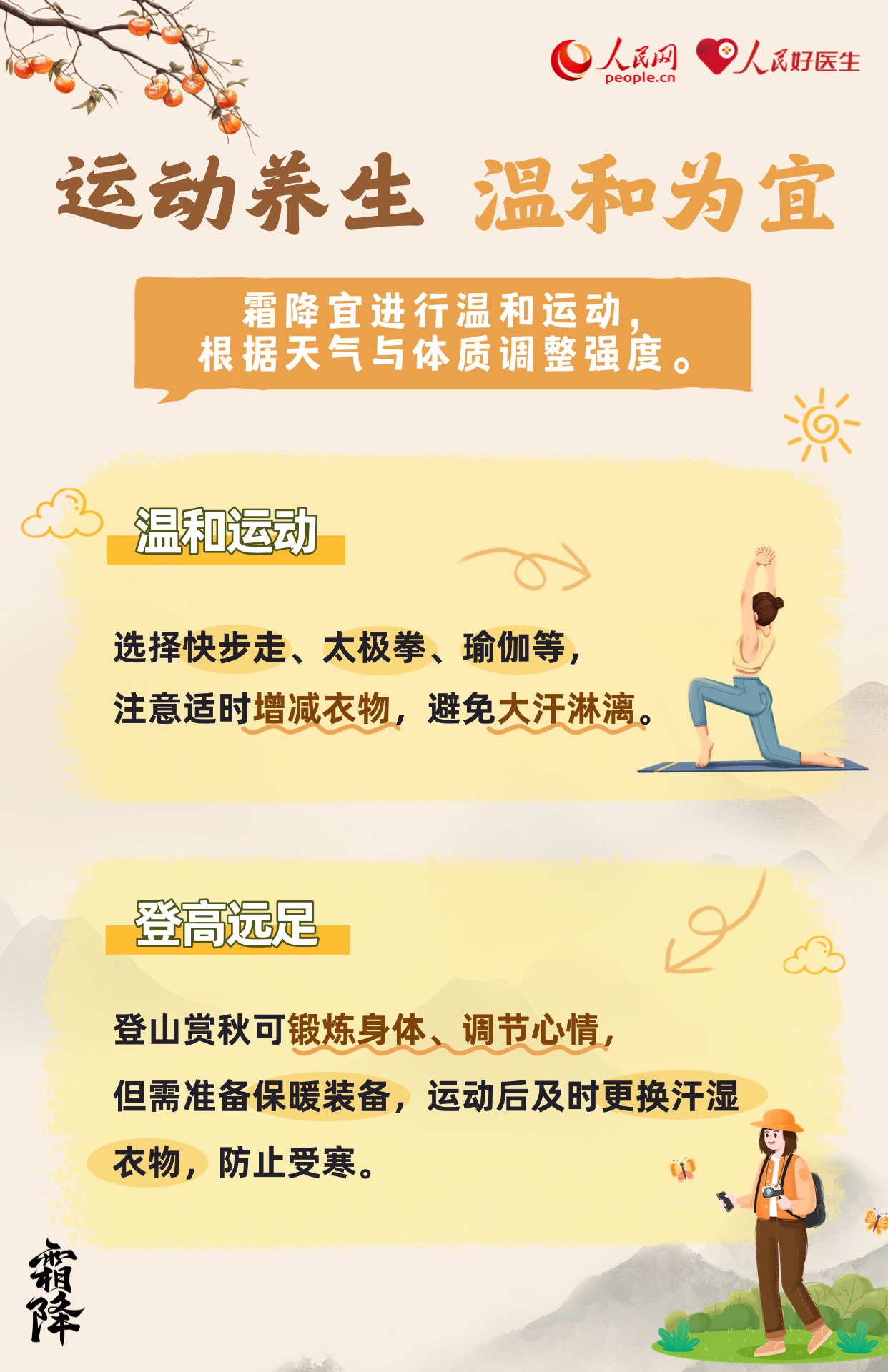 霜降,是二十四節(jié)氣中的第十八個(gè)節(jié)氣,也是秋季最后一個(gè)節(jié)氣。氣溫驟降、晝夜溫差大。養(yǎng)生當(dāng)以“防寒潤燥,滋陰溫陽”為重點(diǎn),此時(shí)節(jié)要做好養(yǎng)生保健,無論起居養(yǎng)生還是運(yùn)動(dòng)調(diào)養(yǎng)都應(yīng)謹(jǐn)慎,湖北省中醫(yī)院治未病中心主任醫(yī)師楊帆為大家?guī)砩钋镳B(yǎng)生攻略。